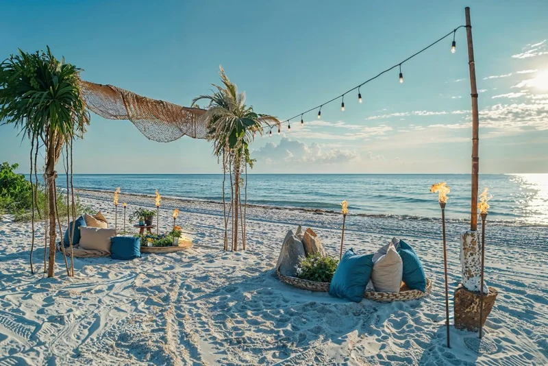 If you’re wondering which beach in Dubai works equally well for families and adult groups, choose Azure Beach. The main pool welcomes guests with children. The adults-only area (21+) has its own rhythm — relaxed, unhurried, without extra noise. As evening falls, the lights come on and the DJ takes over. The menu offers everything from rolls and poke bowls to pizza and desserts. For groups, there are cabanas with private plunge pools.