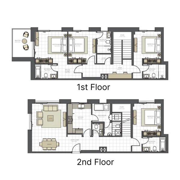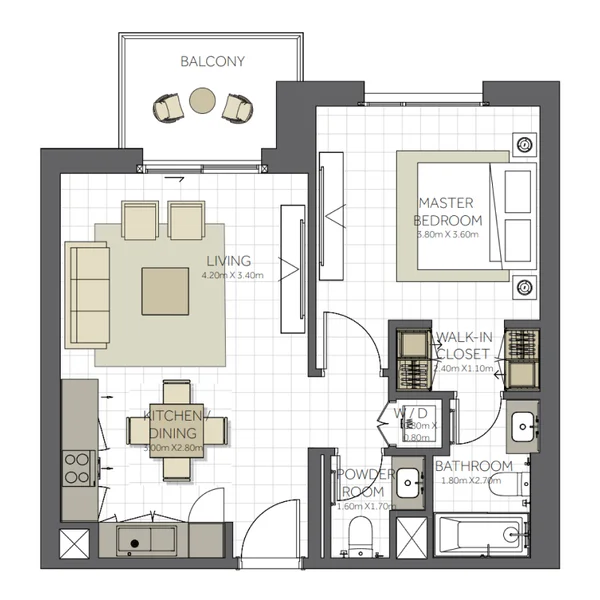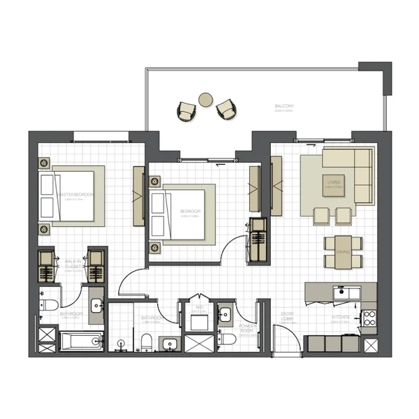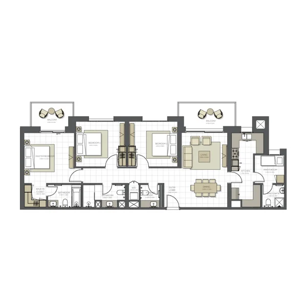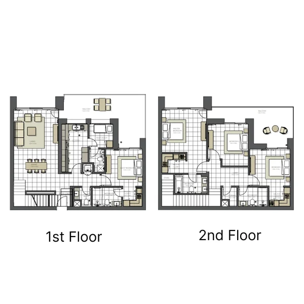 Gypsum ceiling in all bathrooms, kitchens and corridors. Cement plaster painted ceiling in living rooms, bedrooms and maid’s room. Split ducted AC System with multi-zone thermostat controls. Powder coated aluminum frames and double glazed windows. Metal rails on top of glass balustrades on balconies & terraces with powder coated finish. White matte paint & hygenic paint for wet areas. High quality industrial wood & wood finish laminate for doors, cupboards & master bedroom’s wardrobe.