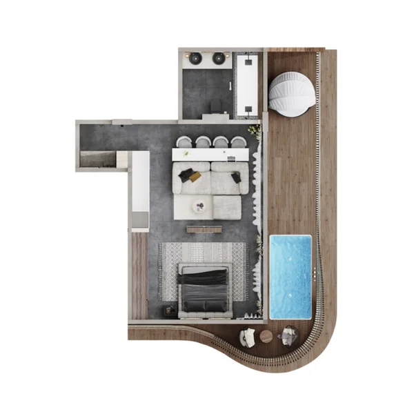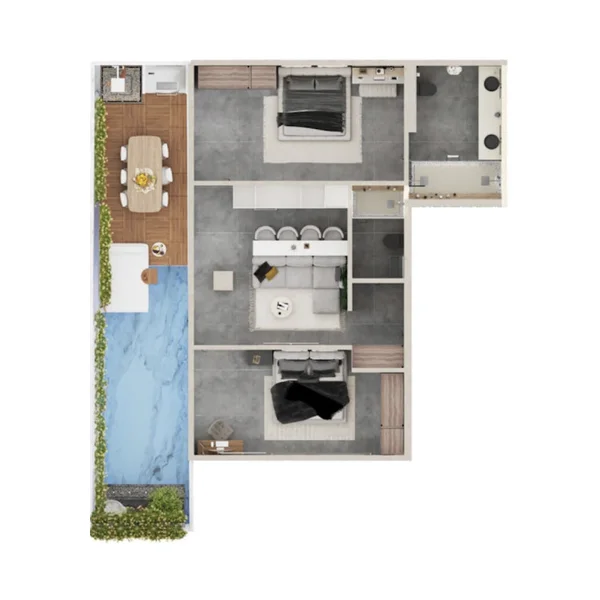 The sophisticated gray tile selection complements the organic tones of the lush tropical landscape surrounding the property. This premium material accentuates the contemporary aesthetic while infusing elegance throughout bathroom and terrace spaces. Warm beige wall treatments establish an inviting and comfortable ambiance within the living areas. Crisp white kitchen designs enhance brightness and create an expanded sense of space throughout the interior.