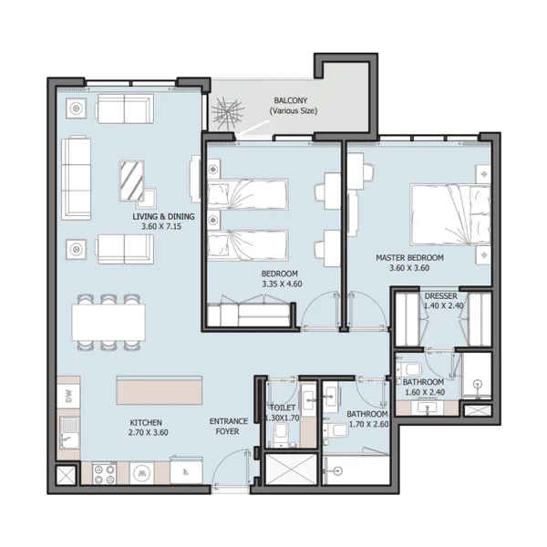 All apartments feature complete finishing utilizing premium contemporary materials. Bathrooms showcase full tiling throughout, complemented by integrated vanity units and mirrors, while bedrooms include custom-built wardrobe systems.