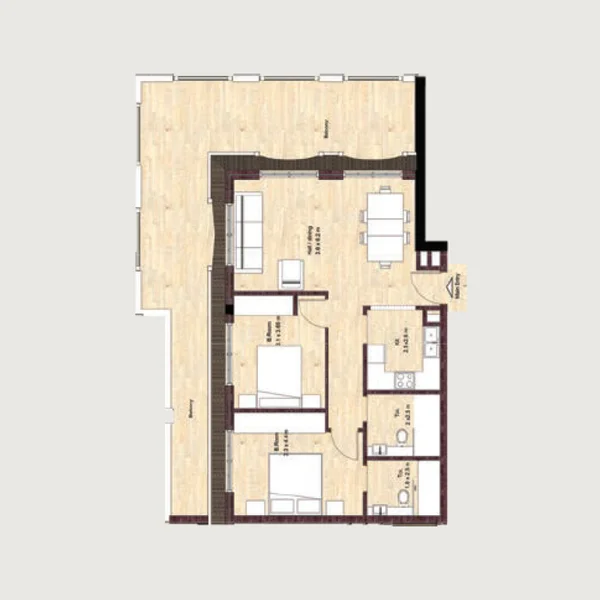 Two Bedroom Apartment includes: Master Bedroom with full-sized double bed and closet, Bedroom with single bed and closet, Separate room kitchen, Living room with dining table, Bathroom with toilet, sink, Maid Room, Balcony.