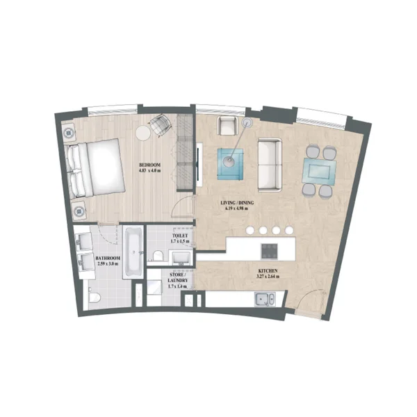 Living areas, bedrooms and hallways feature porcelain and or ceramic flooring of ideal sizes. Ceramic tiled floors and walls (partly), and high quality sanitary ware along with contemporary accessories define your private space. Simple and elegant doors characterized by superior joinery workmanship with high quality ironmongery; external doors fire rated to DCD standards. All cement plastered walls and ceilings shall be painted with Acrylic Copolymer emulsion in Eggshell finish. All bedrooms feature built-in closets with laminated veneer finish and high quality ironmongery.