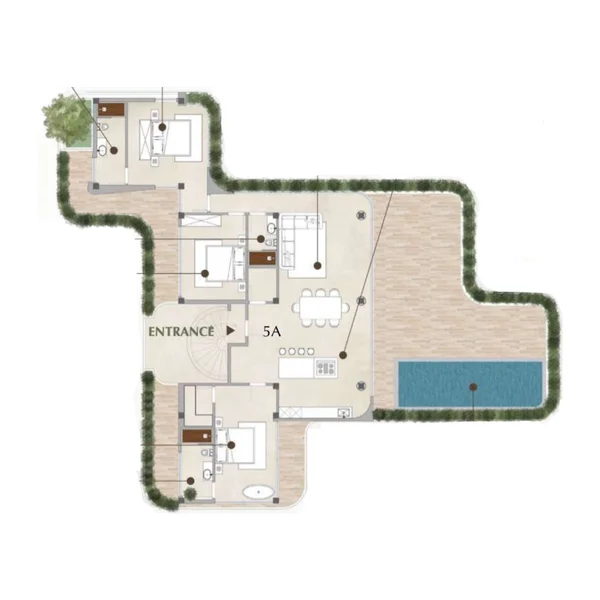 Комплекс включает в себя пять великолепно спроектированных резиденций с 3 спальнями, каждая из которых воплощает в себе изысканную элегантность и современный стиль. Эти исключительные дома очаровывают не только своим потрясающим окружением, но и тщательным мастерством и продуманностью, проявляющимися при их строительстве.