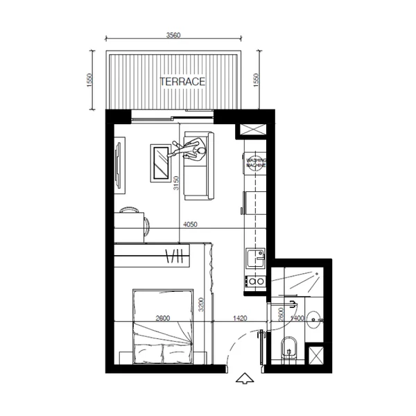 Kitchen cabinets and countertops with refrigerator, washing machine & cooker