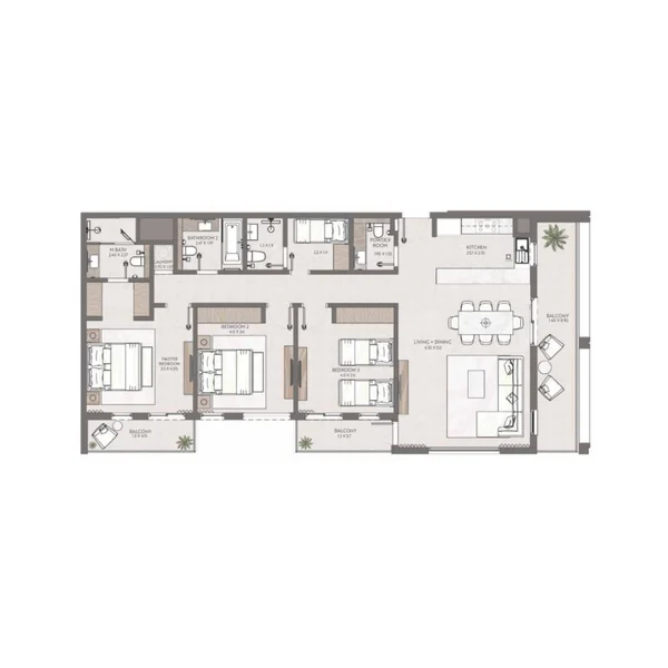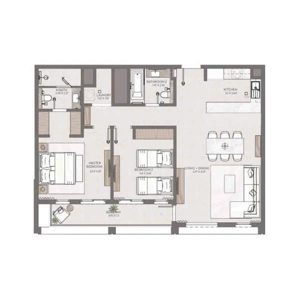 В жилых помещениях представлены тщательно продуманные интерьеры, призванные способствовать гармонии и спокойной жизни. Продуманное пространственное планирование создает плавные планировки, излучающие спокойствие во всех домах. Палитра интерьеров включает в себя успокаивающие сочетания теплых зеленых, коричневых и голубых тонов, создавая мирное убежище в динамичной городской среде Дубая. В каждой квартире есть как минимум один отдельный балкон или терраса, с которых открываются живописные виды на окрестности.