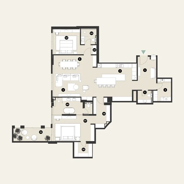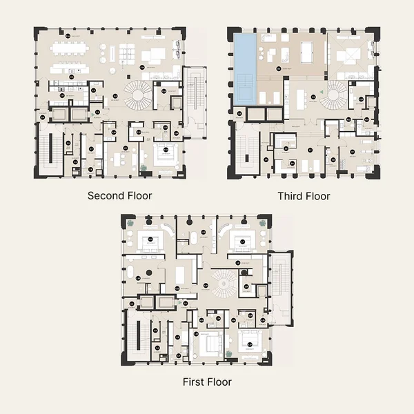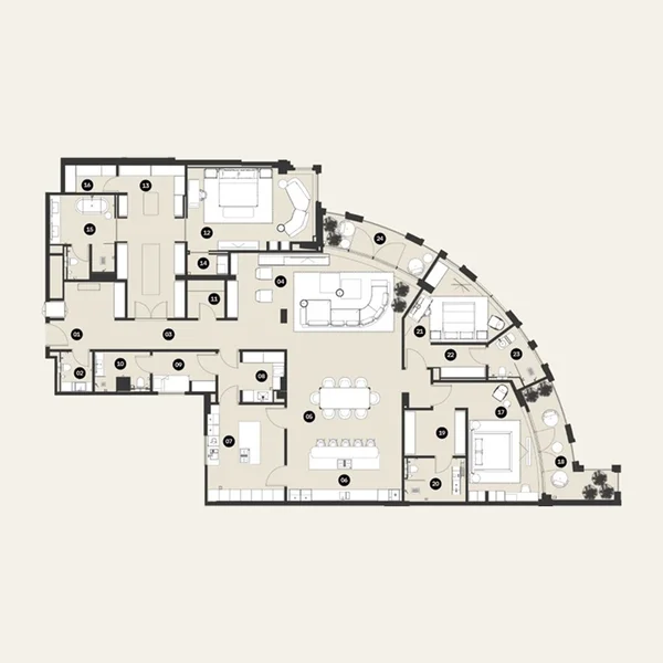 Апартаменты с 2, 3 спальнями, дуплексы с 4 спальнями, пентхаусы с 5 спальнями и триплексы с 5 спальнями