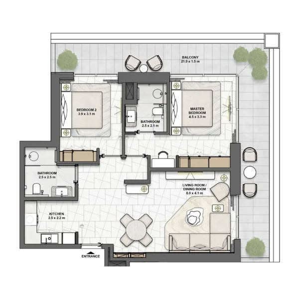 The grandeur of the entrance lobby is finished by a melange of textured surfaces, with the panoramic view outside framed by sheer drapery and complemented by polished walls. The inviting interiors are a melody of stone and metal accents, featuring tiles, wood finishes, and textured glass. An mix of high quality stone, wood, fabric, and metal elements enhances both visual and tactile experiences in every room whilst emphasising sophisticated elegance, tranquillity, and the intimacy of one’s personal space.